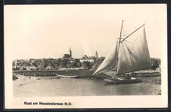 AK Rust am Neusiedlersee, Uferpartie mit Kirche und Segelboot