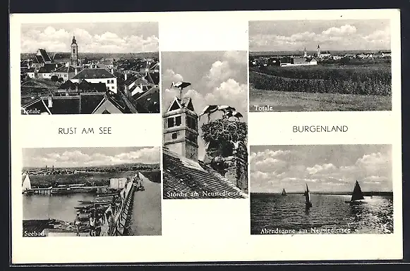 AK Rust am See, Abendsonne am Neusiedlersee, Seebad, Storchennest
