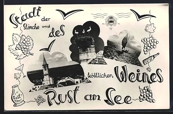 AK Rust am See, Kirche, Störche im Nest, Segelboot auf See