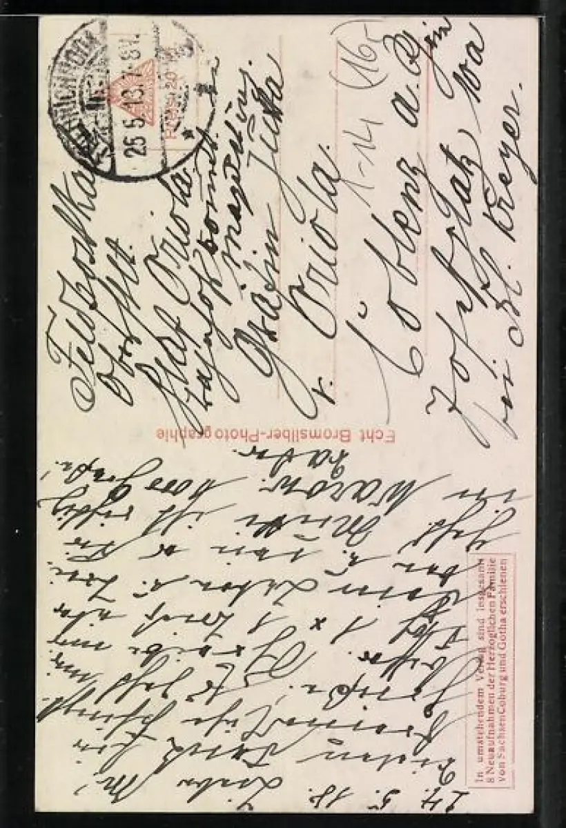 Personenbezogene Daten auf der Rückseite der Karte wurden durch blauen Textmarker unkenntlich gemacht. Die blauen Stellen sind auf die Vorderseite durchgeweicht und wirken sich negativ auf das Postkartenfoto aus