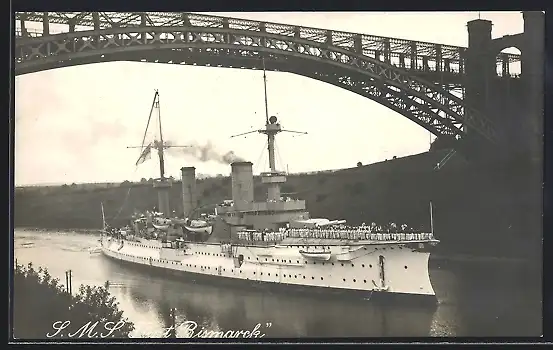 AK S. M. S. Fürst Bismarck, Kriegsschiff des Ostasiengeschwaders unter einer Brücke