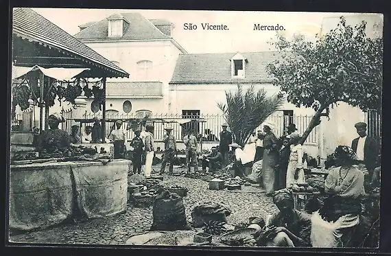AK S. Vicente, Leute an Ständen auf dem Markt