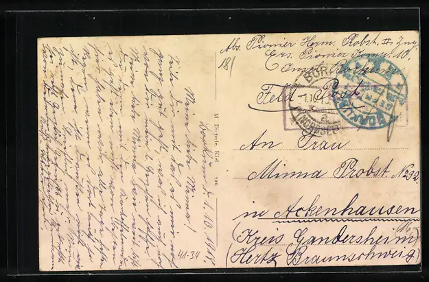 Personenbezogene Daten auf der Rückseite der Karte wurden durch blauen Textmarker unkenntlich gemacht. Die blauen Stellen sind auf die Vorderseite durchgeweicht und wirken sich negativ auf das Postkartenfoto aus