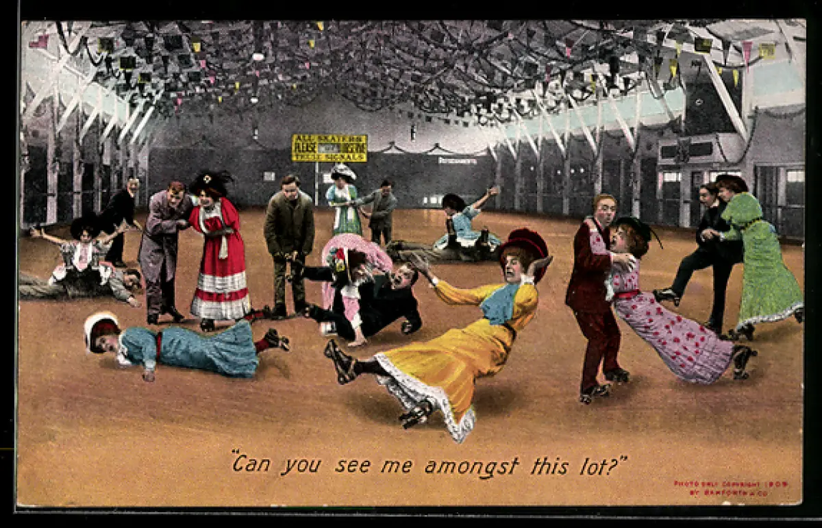 AK Saal mit umfallenden Rollschuhfahrern