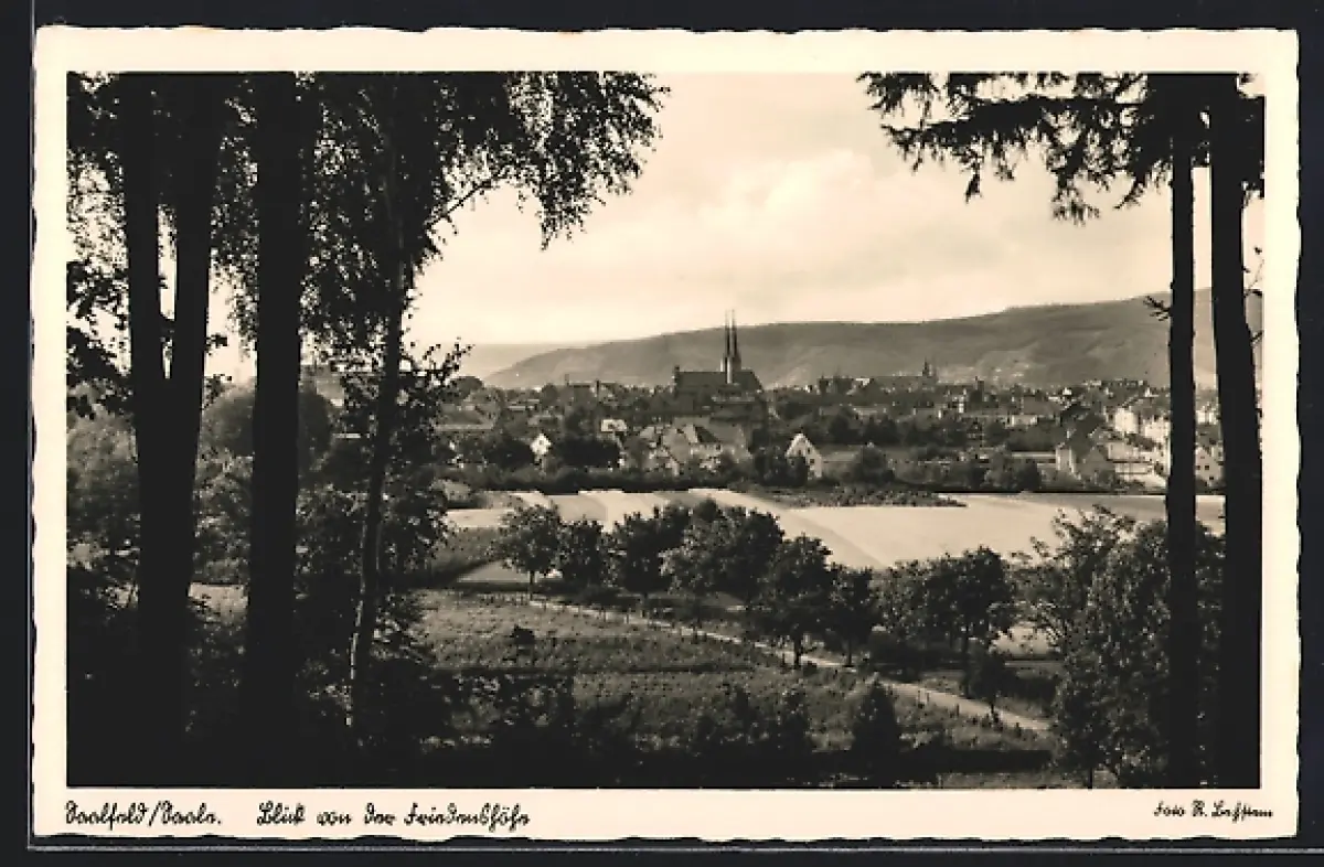 AK Saalfeld / Saale, Ortsansicht aus der Vogelschau, Blick zur Kirche