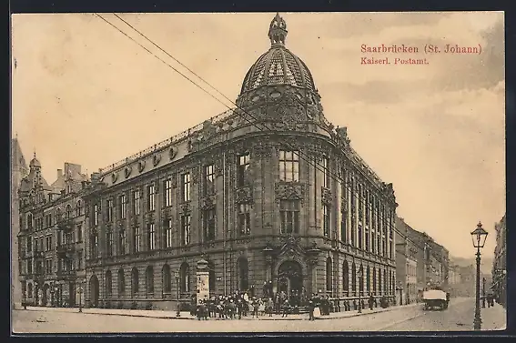 AK Saarbrücken, Blick auf das Kaiserliche Postamt, Littfasssäule