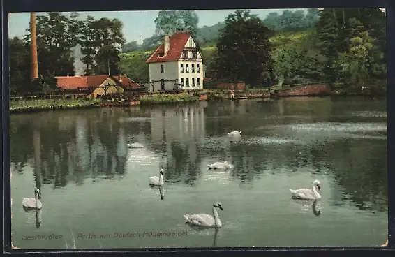 AK Saarbrücken, Deutsch-Mühlenweiher mit Schwänen