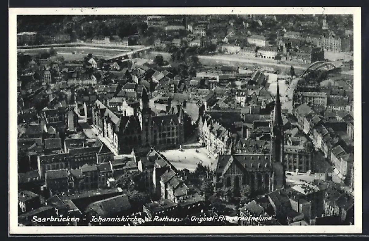 AK Saarbrücken, Johanniskirche, Rathaus, Luftaufnahme