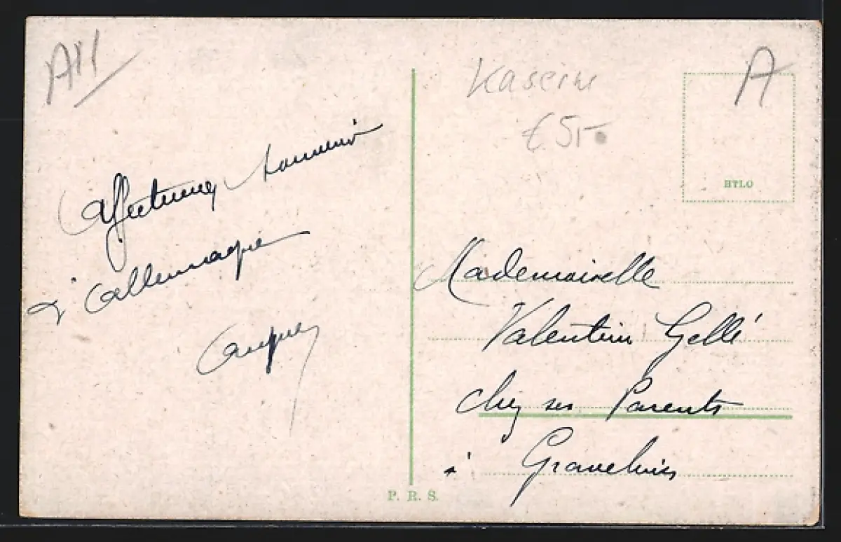 Personenbezogene Daten auf der Rückseite der Karte wurden durch blauen Textmarker unkenntlich gemacht. Die blauen Stellen sind auf die Vorderseite durchgeweicht und wirken sich negativ auf das Postkartenfoto aus