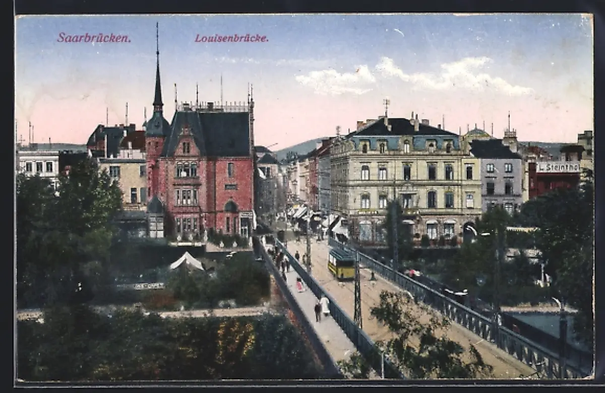 AK Saarbrücken, Louisenbrücke, Strassenbahn, Stadtansicht