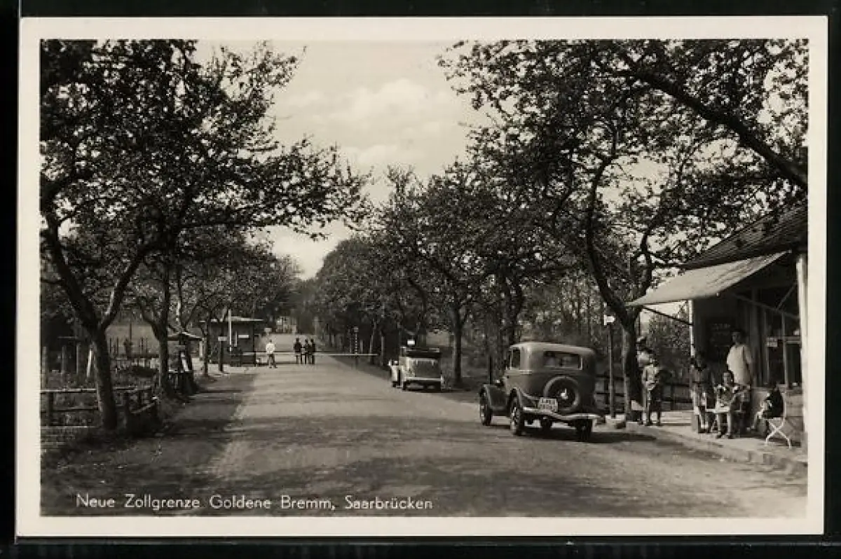 AK Saarbrücken, Neue Zollgrenze Goldene Bremm, Autos vor dem Schlagbaum