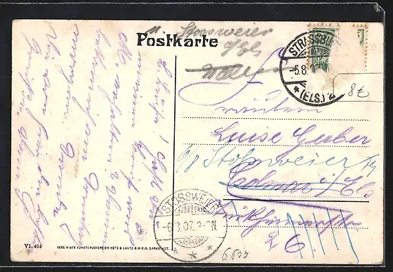 alte Ansichtskarte, gelaufen 1907, Briefmarke entfernt, rückseitig Oberflächenschaden, guter Zustand