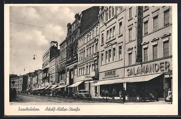 AK Saarbrücken, Strasse, Geschäftshäuser, Salamander