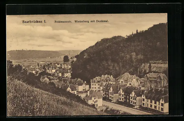 AK Saarbrücken, Winterberg mit Denkmal und Feldmannstrasse