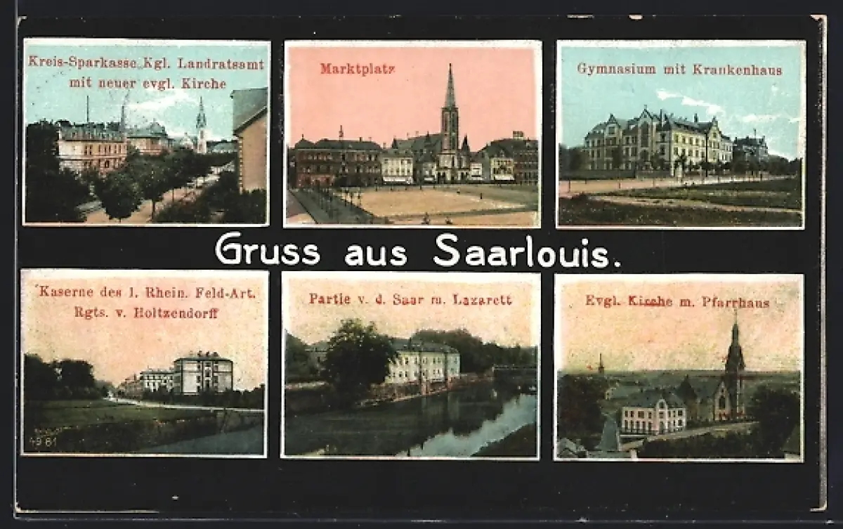 AK Saarlouis, Marktplatz, Kaserne des 1. Rhein. Feld-Art. Regts. v. Holtzendorff, evgl. Kirche mit Pfarrhaus