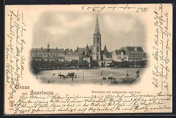 AK Saarlouis, Marktplatz mit Amtsgericht und Post aus der Vogelschau