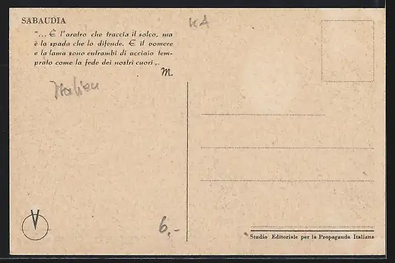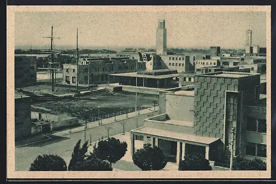 AK Sabaudia, Teilansicht mit Rathausturm und Segelschiff