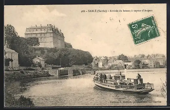 AK Sablé, Arrivée du bateau à vapeur d`Angers devant le château et la rivière
