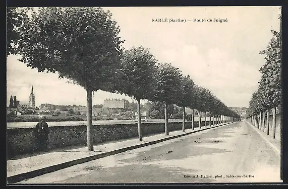 AK Sablé, Route de Juigné bordée d`arbres avec vue sur l`église et le château au loin