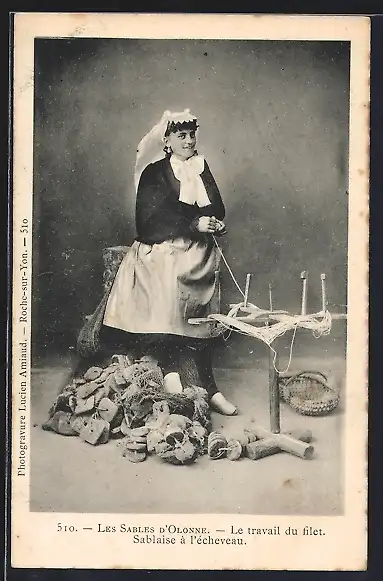 AK Sables-d`Olonne, Le travail du filet, Sablaise a l`echeveau, Fischerin beim Netzknüpfen