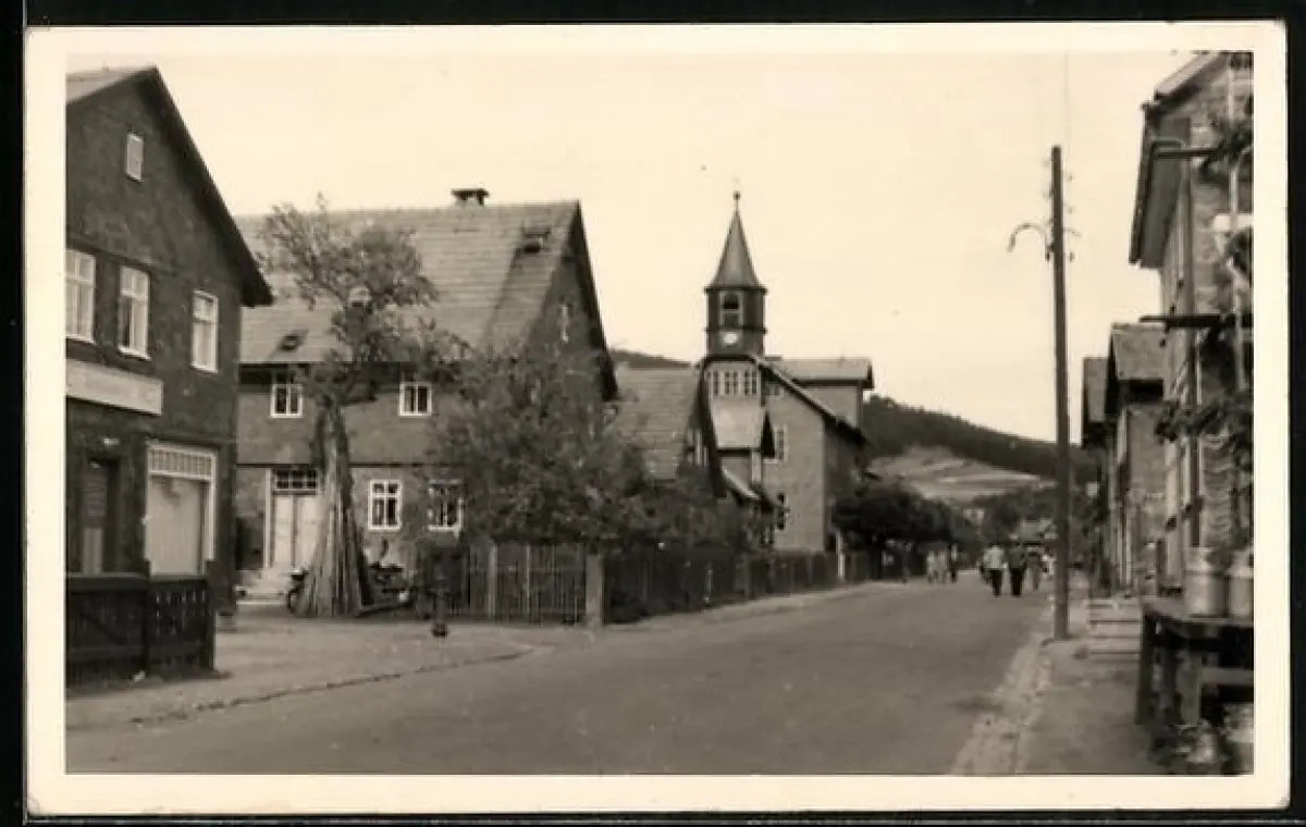 AK Sachsenbrunn /Thür.Wald, Strassenansicht mit Kirche