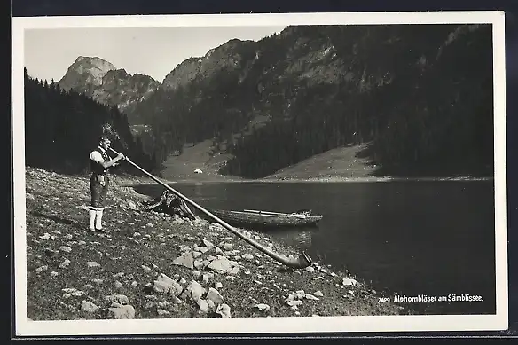AK Sämtisersee, Alphornbläser in Tracht am Ufer