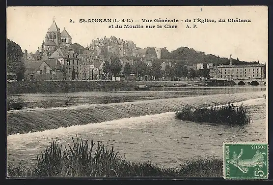 AK Saint-Aignan, Vue générale de l`église, du château et du moulin sur le Cher