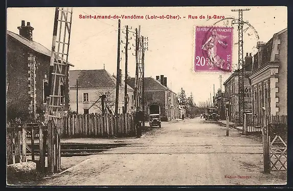 AK Saint-Amand-de-Vendôme, Rue de la Gare avec passage à niveau et bâtiments adjacents