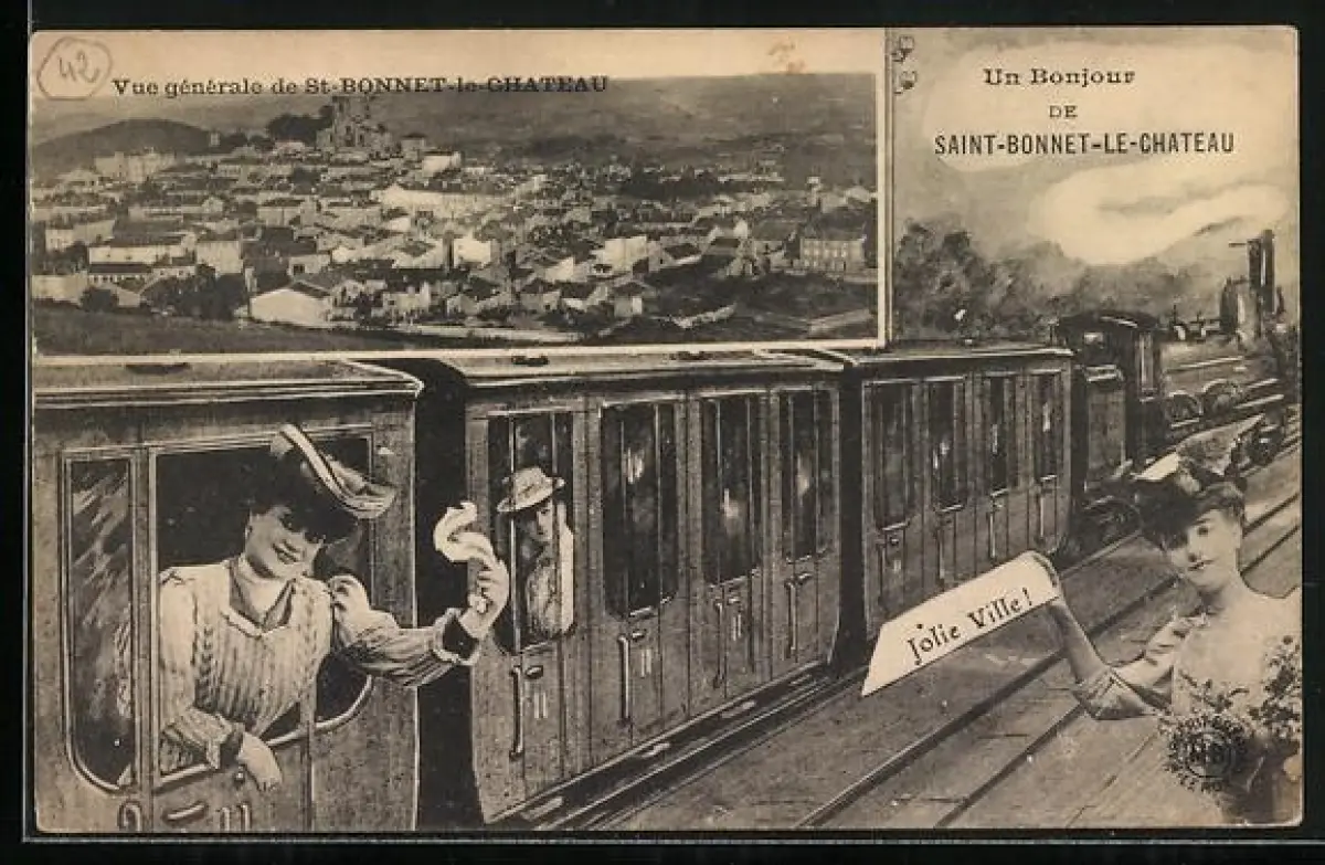 AK Saint-Bonnet-le-Château, Vue générale et train avec passagers saluant