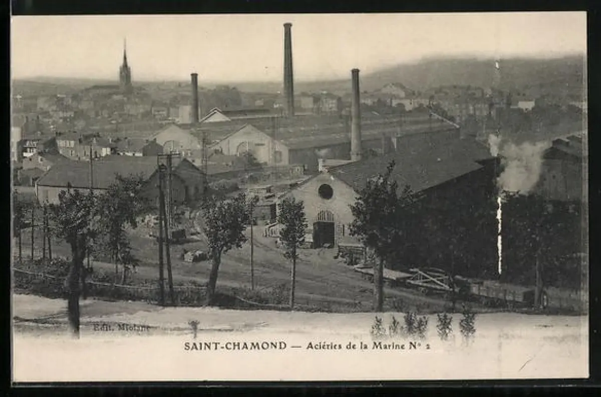 AK Saint-Chamond, Aciéries de la Marine N° 2 avec vue sur la ville et chemin bordé d`arbres