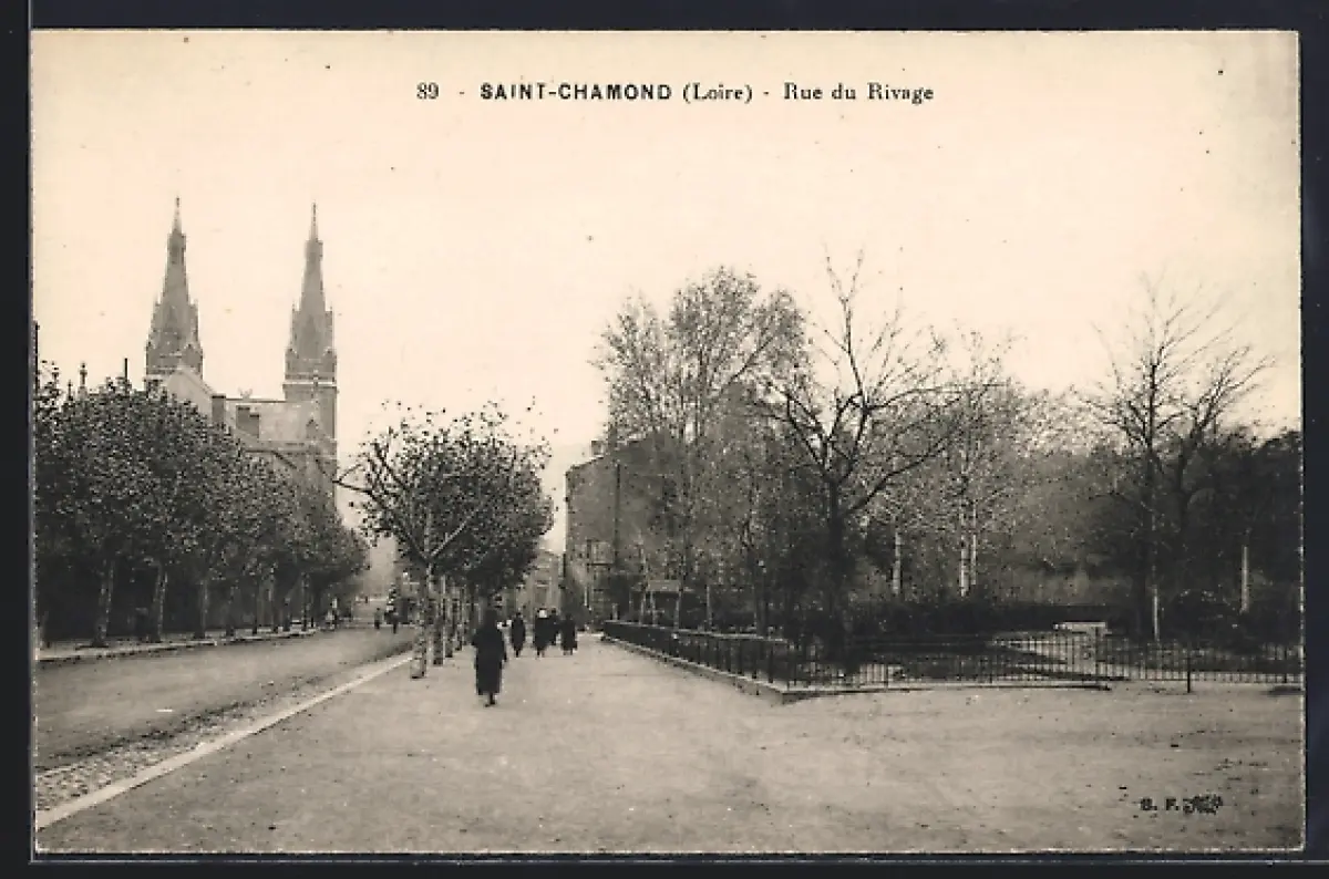 AK Saint-Chamond /Loire, Rue du Rivage avec vue sur les flèches de l`église et les arbres en hiver