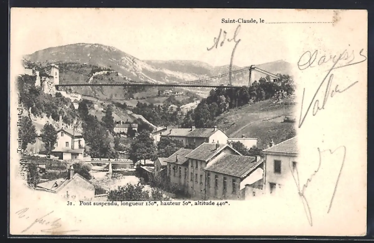 AK Saint-Claude, Pont suspendu et vue du village entouré de collines