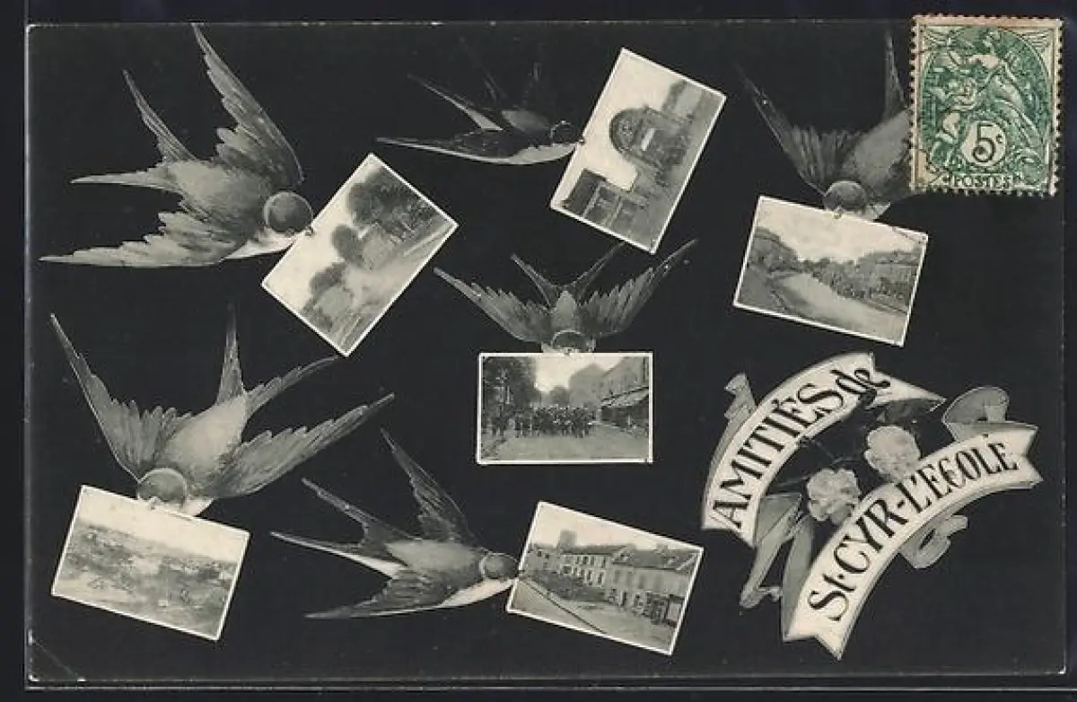 AK Saint-Cyr-l`École, Hirondelles transportant des photos avec inscription Amitiés de St-Cyr-l`École