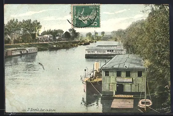 AK Saint-Denis, Bains froids sur la Seine avec bateaux à quai