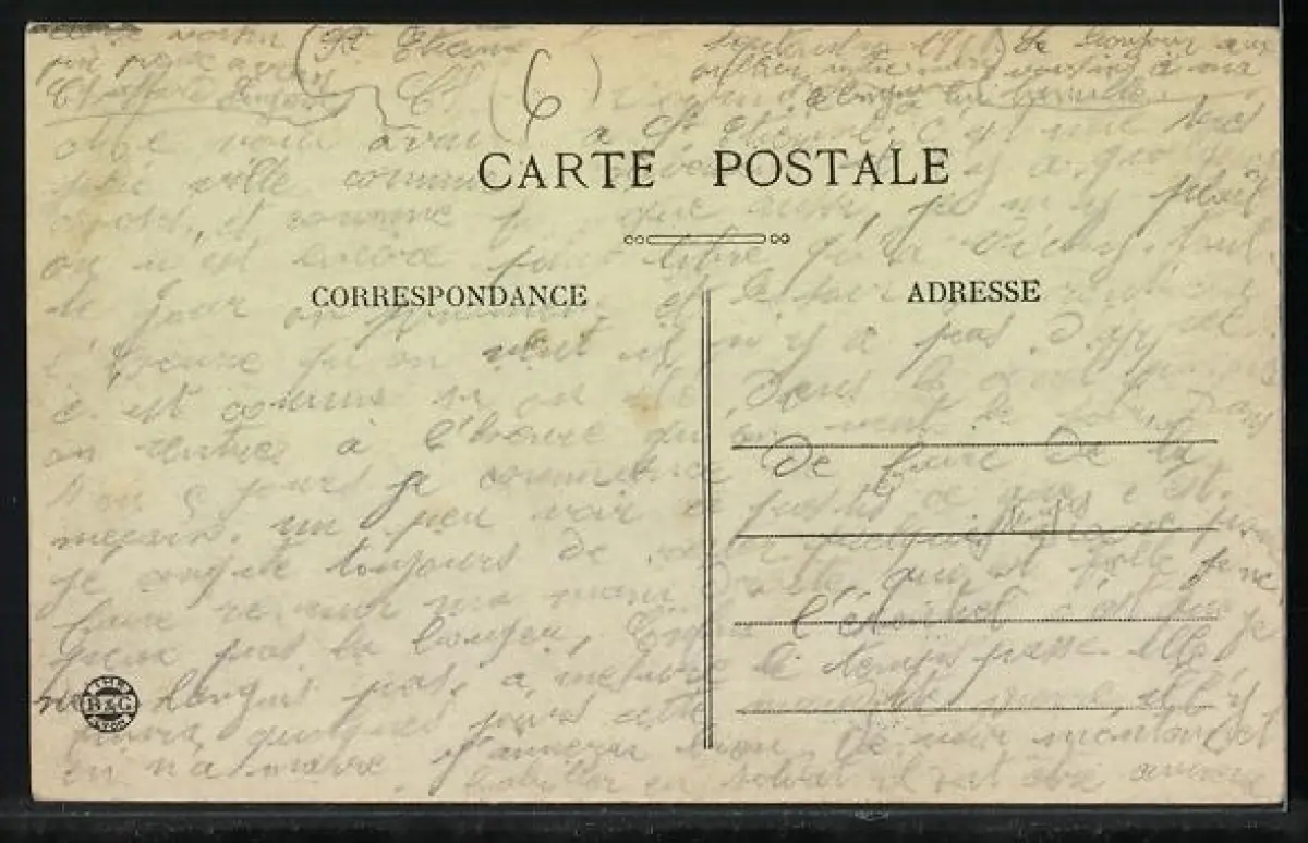 Personenbezogene Daten auf der Rückseite der Karte wurden durch blauen Textmarker unkenntlich gemacht. Die blauen Stellen sind auf die Vorderseite durchgeweicht und wirken sich negativ auf das Postkartenfoto aus