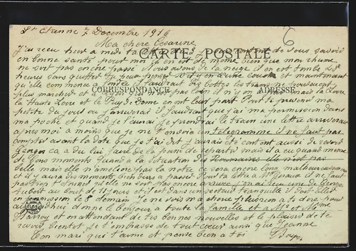 Personenbezogene Daten auf der Rückseite der Karte wurden durch blauen Textmarker unkenntlich gemacht. Die blauen Stellen sind auf die Vorderseite durchgeweicht und wirken sich negativ auf das Postkartenfoto aus