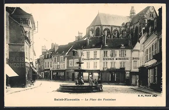 AK Saint-Florentin, La Place des Fontaines avec ses commerces et la fontaine centrale