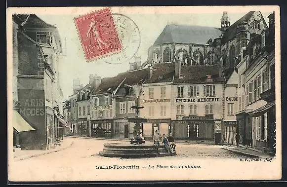 AK Saint-Florentin, La Place des Fontaines avec vue sur les commerces et l`église en arrière-plan