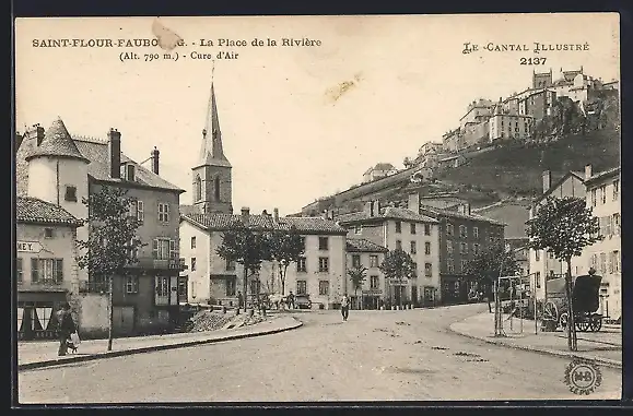 AK Saint-Flour-Faubourg, La Place de la Rivière avec vue sur l`église et les maisons adjacentes
