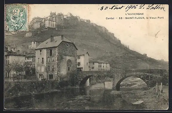 AK Saint-Flour, le Vieux Pont et vue sur la colline avec maisons historiques