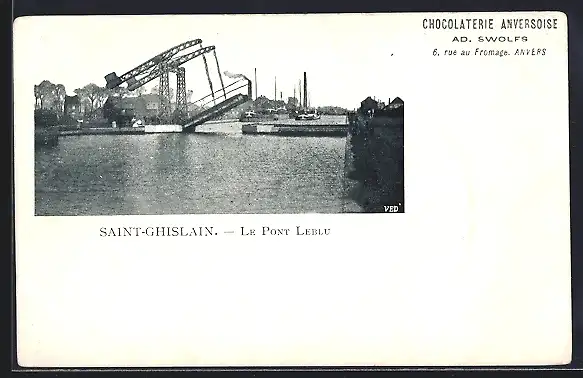 AK Saint-Ghislain, Le Pont Leblu, Anvers, Chocolaterie Anversoise Ad. Swolfs, 6, Rue au Fromage