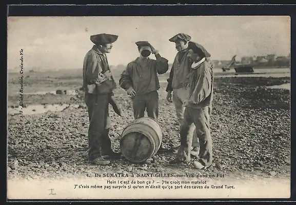 AK Saint-Gilles-sur-Vie, Fass aus Sumatra als Strandgut, Probe des Inhalts