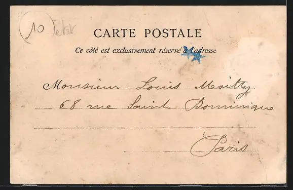 Personenbezogene Daten auf der Rückseite der Karte wurden durch blauen Textmarker unkenntlich gemacht. Die blauen Stellen sind auf die Vorderseite durchgeweicht und wirken sich negativ auf das Postkartenfoto aus