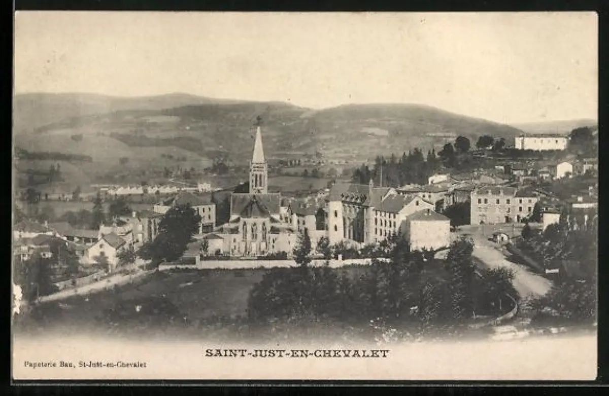 AK Saint-Just-en-Chevalet, Vue générale du village avec église et collines en arrière-plan