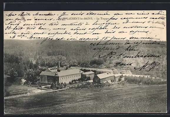AK Saint-Laurent-les-Bains, La Trappe avec vue sur le monastère entouré de forêts
