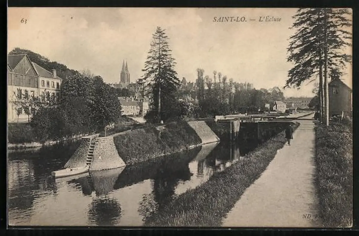 AK Saint-Lo, L`écluse et vue sur l`église en arrière-plan