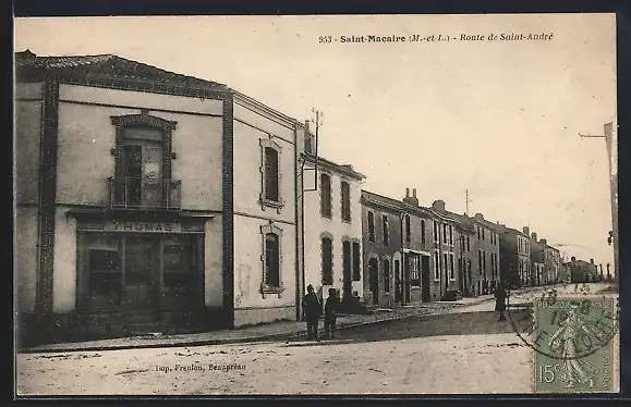 AK Saint-Macaire, Route de Saint-André avec bâtiments et passants