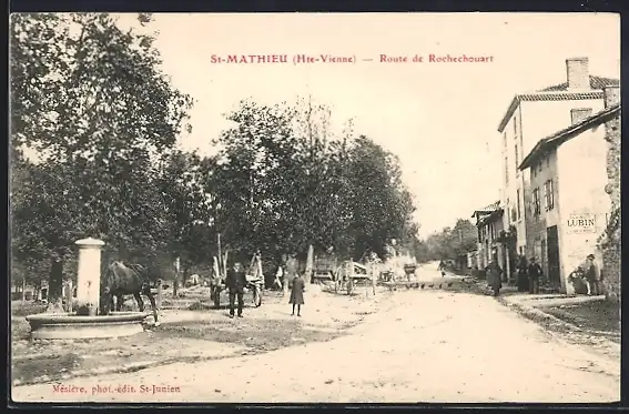 AK Saint-Mathieu, Route de Rochechouart avec passants et chevaux