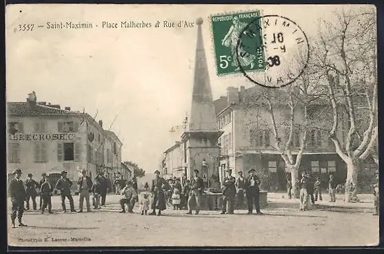 AK Saint-Maximin, Place Malherbes et Rue d`Aix animée avec passants et obélisque