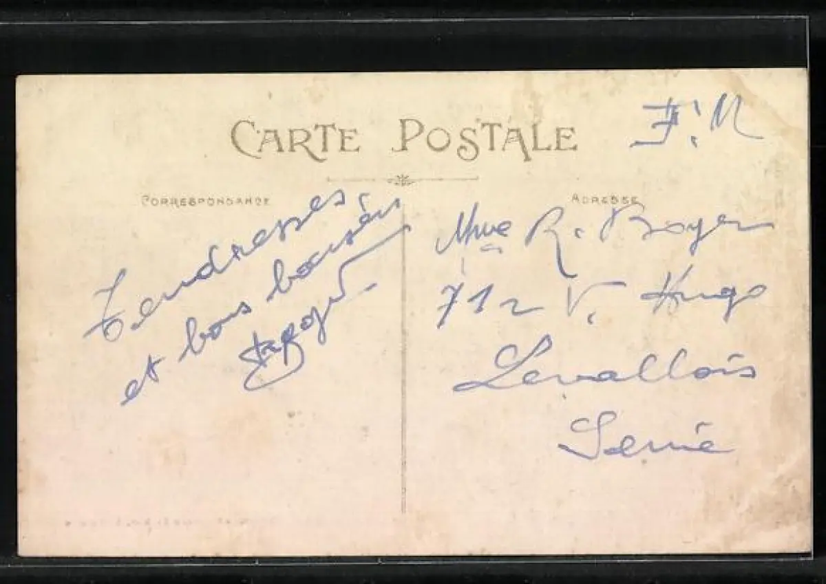 Personenbezogene Daten auf der Rückseite der Karte wurden durch blauen Textmarker unkenntlich gemacht. Die blauen Stellen sind auf die Vorderseite durchgeweicht und wirken sich negativ auf das Postkartenfoto aus